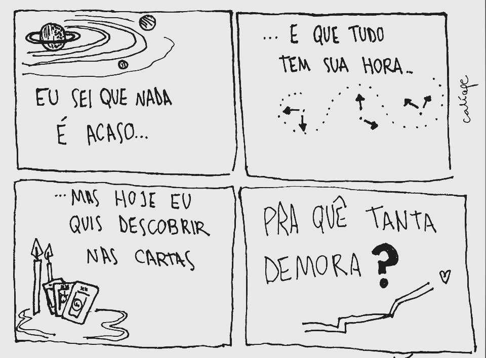 Quando eu jogava, era diferente da cartomante de Macabéa. Nunca prometi a verdade ou 100% de acerto, porque, na minha visão (aqui saliento: minha visão, eu, karina), tarot é muito mais do que isso. Sempre senti e vi as cartas como formas de organizar imageticamente alguns sentimentos e angústias, como se colocassem 78 palavras ali para criar um texto que pudesse trazer um pouco de lucidez. Como se a alma desenhasse para o nosso lado racional entender algumas coisas que só pensar sobre não rola.